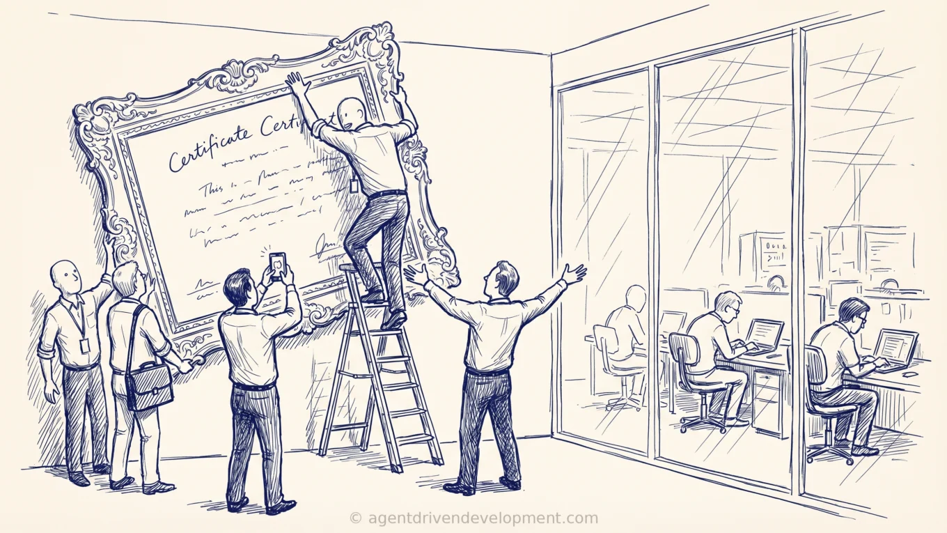 I am not asking you to stand up an internal certification program. I am not asking you to pay a third party to run a two-day workshop and hand out a badge. I am not asking you to add a line on your engineers’ LinkedIn profiles that says “Certified AI-Native Developer” with your company logo on it. The industry has run that play before, repeatedly, and it has not produced the thing it said it would produce. We spent a decade watching Certified Scrum Masters run stand-ups that looked exactly like the status meetings they were supposed to replace. We watched Certified Agile Coaches facilitate the same release-train rituals the organization already had, with new words taped over the old ones. The certification did not transfer the competency. It transferred a receipt.