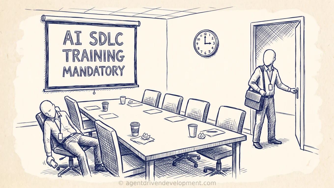 Here is the part that will sting. Your decade-old Agile transformation organization, the one with the coaches and the Scaled Agile certifications and the big visible board on the fourth floor, is going to make noise. Friday 3 PM is exactly when their teams do retros with the coach. Well, the half of the team that could not figure out how to escape the office fast enough, anyway. That is why the AI SDLC training landed there. It collided with the one recurring artifact the Agile PMO still protects, somebody did not want to have the fight, and the training got quietly bolted onto the same sad dead-end slot. They called it a scheduling win.