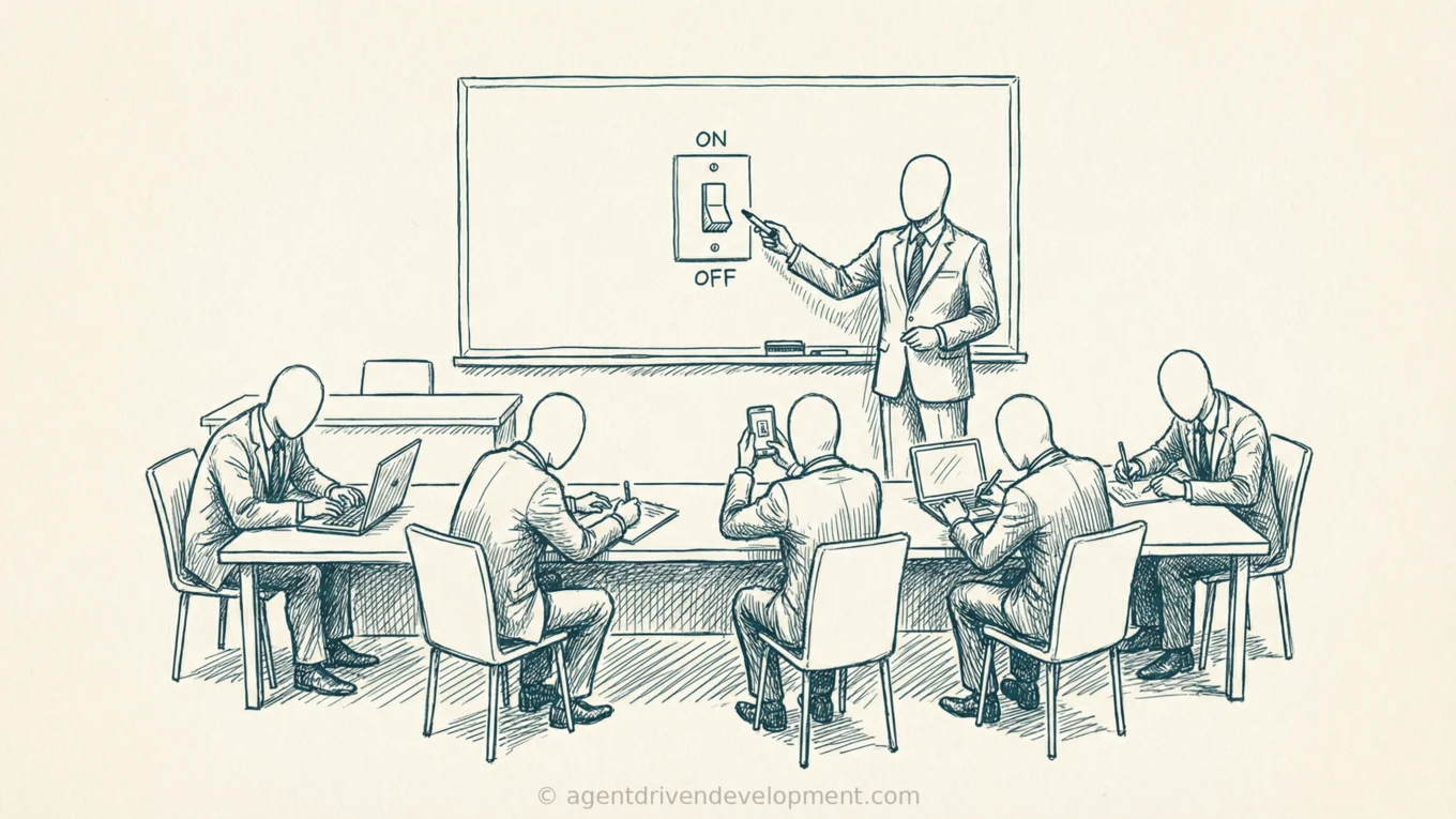 I sat in a steering committee meeting last year at a financial services company (a large one, the kind with a campus and a cafeteria that serves sushi on Thursdays). The agenda was “AI Strategy Review.” Eight people in the room. The CTO, three VPs, two directors, the vendor’s account executive, and the vendor’s field CTO. The vendor’s field CTO presented for forty-five minutes. He had slides with the company’s logo on them, usage metrics from their deployment, and a roadmap for the next two quarters of expanded adoption.
